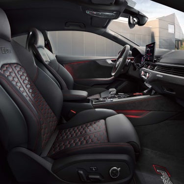 The command centre of the Audi RS 5 Coupé² exudes exclusivity. Elegant front sport seats plus with RS embossing, optionally available in fine Nappa leather with honeycomb pattern and stitching in contrasting colour, combine with the sport contour leather steering wheel in 3-spoke design, flattened at the bottom, with multifunction plus, RS emblem and aluminium shift paddles to continue the performance character in the interior. The optional Audi virtual cockpit plus, with RS-specific information on torque, lap times, G-forces and optionally on tyre pressure and temperature, is a real highlight.
